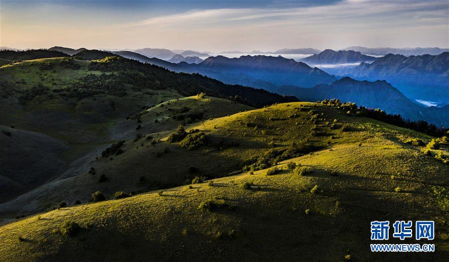 6月30日,朝霞照耀下的神田草甸與遠(yuǎn)處的群峰(無(wú)人機(jī)照片)。位于陜西省安康市嵐皋縣與重慶市城口縣交界處大巴山神田主脊北坡的神田草甸,面積超過(guò)1.1萬(wàn)畝。夏日的朝霞中,起伏的草甸仿佛一塊寬大無(wú)邊的綠色地毯,鑲嵌在大巴山上,如詩(shī)如畫。新華社記者陶明攝