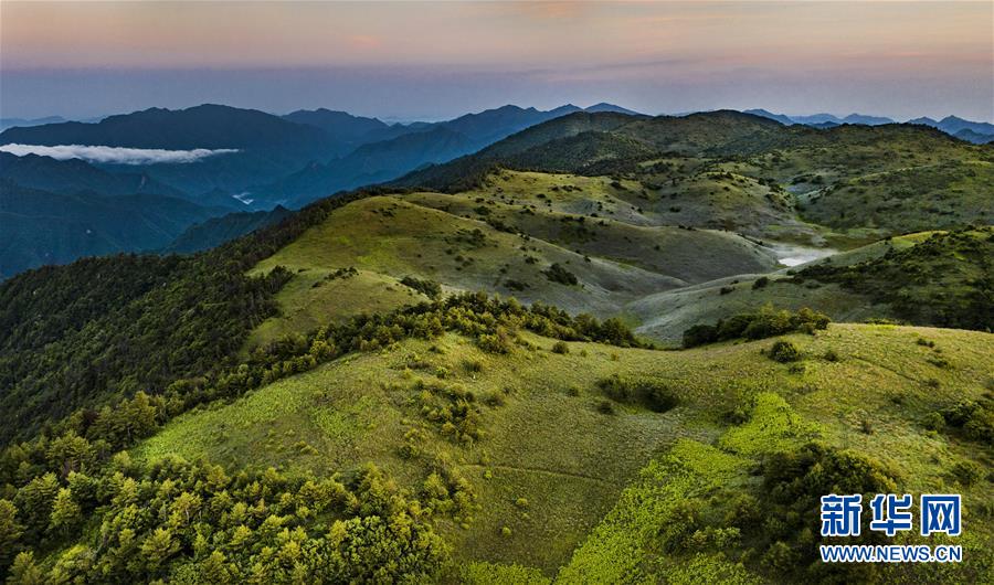 6月30日,晨曦中的神田草甸(無(wú)人機(jī)照片)。位于陜西省安康市嵐皋縣與重慶市城口縣交界處大巴山神田主脊北坡的神田草甸,面積超過(guò)1.1萬(wàn)畝。夏日的朝霞中,起伏的草甸仿佛一塊寬大無(wú)邊的綠色地毯,鑲嵌在大巴山上,如詩(shī)如畫。新華社記者陶明攝