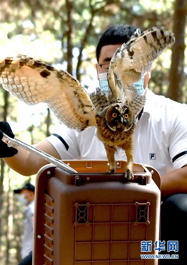 7月1日,吉林省野生動(dòng)物救護(hù)繁育中心工作人員放飛一只長(zhǎng)耳鸮。新華社記者林宏攝
