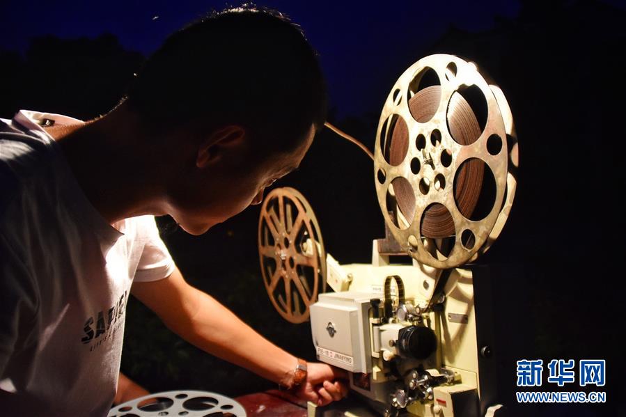 6月30日晚,電影放映中,朱強(qiáng)在更換膠片。新華社記者鄭夢(mèng)雨攝