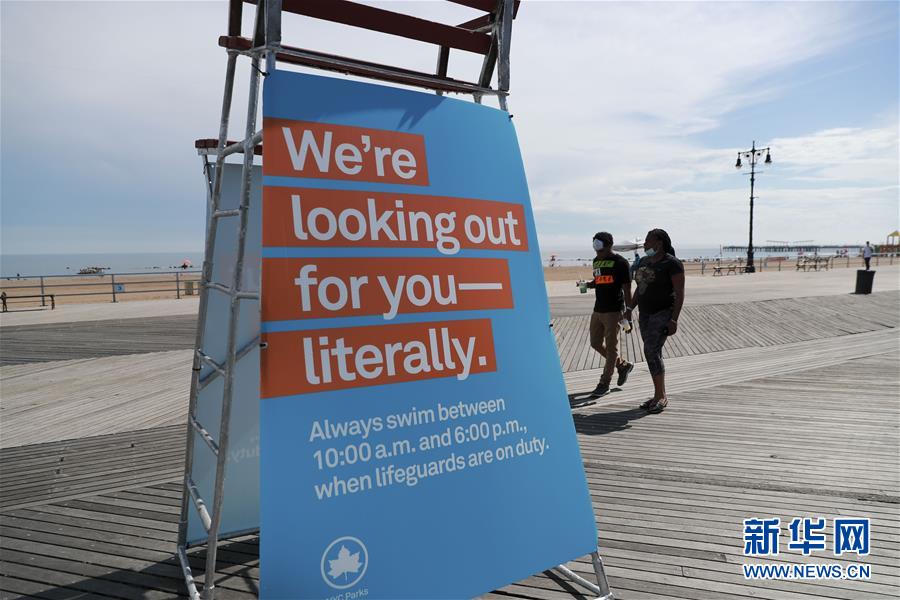 這是7月1日在美國紐約科尼島一處海灘上拍攝的關(guān)于允許游泳時間的提示牌。當日,美國紐約市屬八處海灘正式重新準許民眾游泳,救生員也同時上崗。新華社記者王迎攝