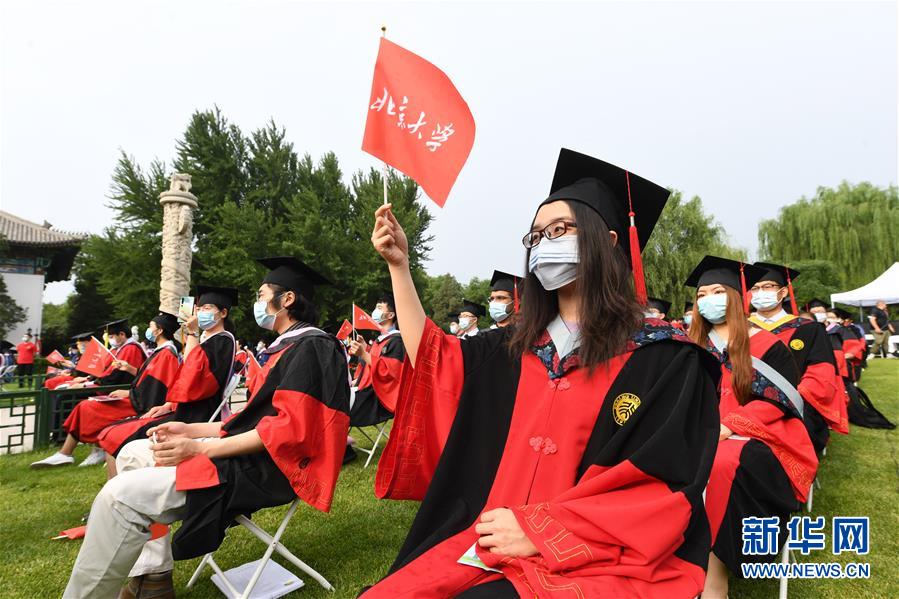 7月2日,北京大學(xué)2020屆畢業(yè)生在畢業(yè)典禮上。當(dāng)日,北京大學(xué)舉行2020年畢業(yè)典禮。由于疫情防控需要,今年的典禮在北京大學(xué)辦公樓西側(cè)廣場、靜園草坪、未名湖等九個會場舉行,并面向全球進行中英文雙語直播,僅部分在校畢業(yè)生現(xiàn)場參加,更多畢業(yè)生通過線上直播參與畢業(yè)典禮。新華社記者任超攝