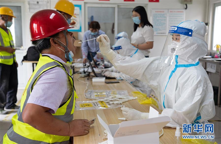 7月2日,在北京市大興區(qū)中建三局二公司北京公司一項(xiàng)目建筑工地的臨時(shí)核酸檢測(cè)采樣點(diǎn),醫(yī)護(hù)人員為建筑工地人員采集咽拭子。新華社記者才揚(yáng)攝
