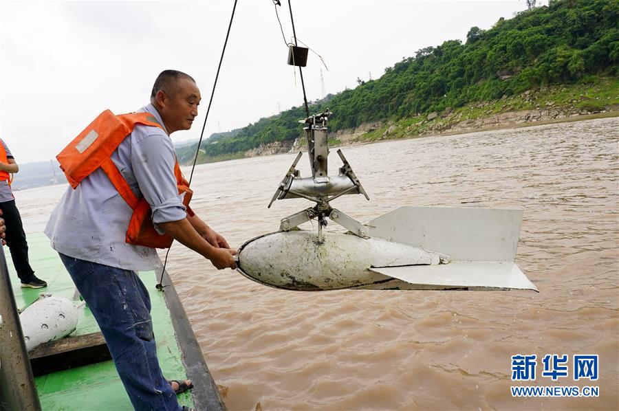 7月2日,在水文作業(yè)船上,長江清溪場水文站工作人員將水樣采集鉛魚放入水中。
