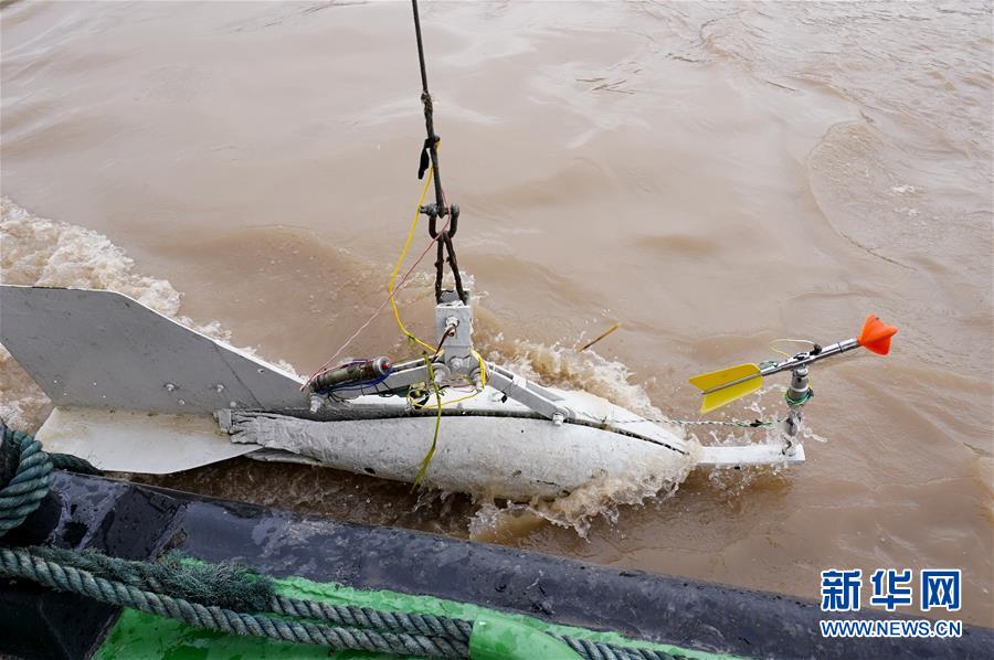7月2日,裝有流速測量儀器的鉛魚完成測量作業(yè)后,由吊車吊出長江水面。新華社記者劉潺攝