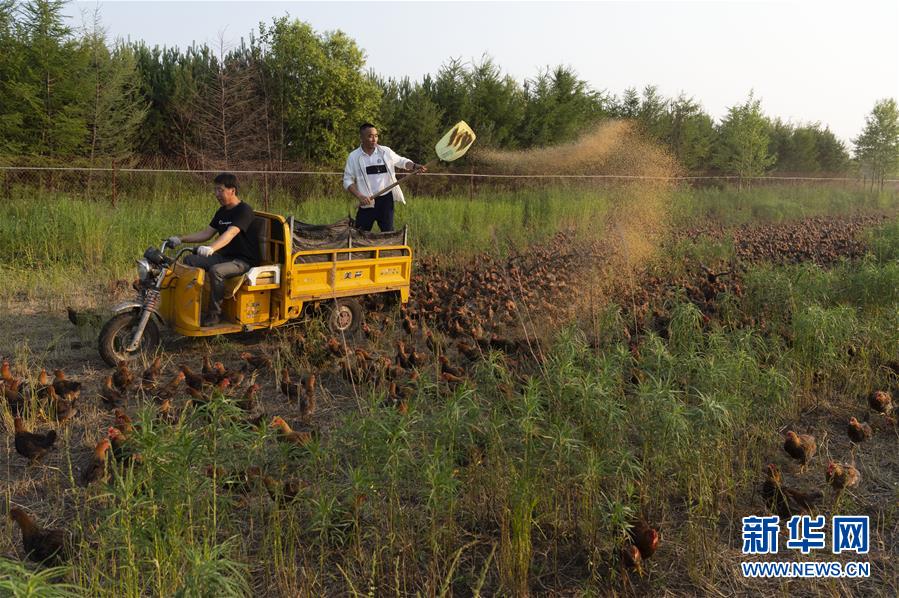 7月1日,在黑龍江省五大連池市的草原上,桑慶軍在三輪車上拋撒飼料喂雞。新華社記者謝劍飛攝