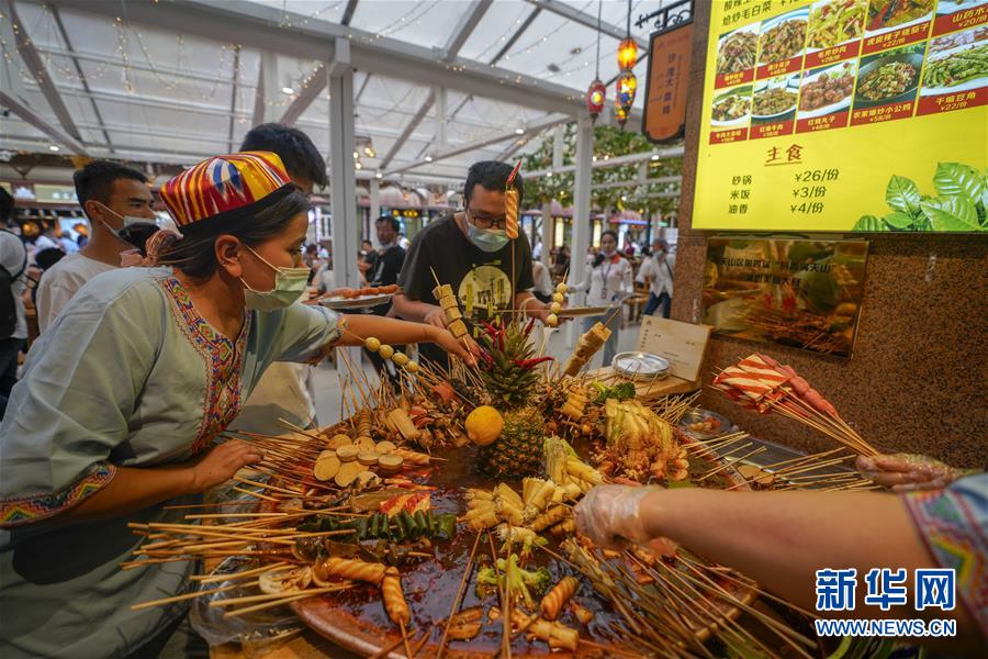 游客在烏魯木齊大巴扎景區(qū)挑選麻辣燙(7月4日攝)。夏日周末,烏魯木齊市大巴扎景區(qū)內(nèi)熙熙攘攘,人們來到這里品嘗美食、休閑購物。2018年,經(jīng)過靚化改造后的大巴扎景區(qū)新增長約800米的步行街,分為文創(chuàng)文旅和“非遺”項目街區(qū)、國際時尚街區(qū)和大巴扎美食街區(qū),是烏魯木齊最受歡迎的旅游目的地之一。新華社記者趙戈攝