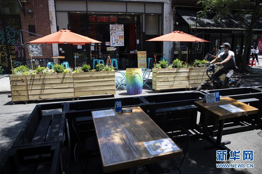 7月6日,一名男子騎車(chē)從美國(guó)紐約一家餐廳的戶外餐區(qū)旁經(jīng)過(guò)。當(dāng)天,紐約進(jìn)入重啟第三階段,美甲店、按摩店等個(gè)人護(hù)理業(yè)在經(jīng)歷近4個(gè)月的停業(yè)后被允許重新開(kāi)放。因防疫需要,原本應(yīng)在第三階段開(kāi)放的餐飲業(yè)室內(nèi)就餐仍處于暫停狀態(tài)。新華社記者王迎攝
