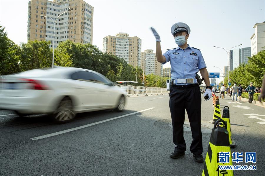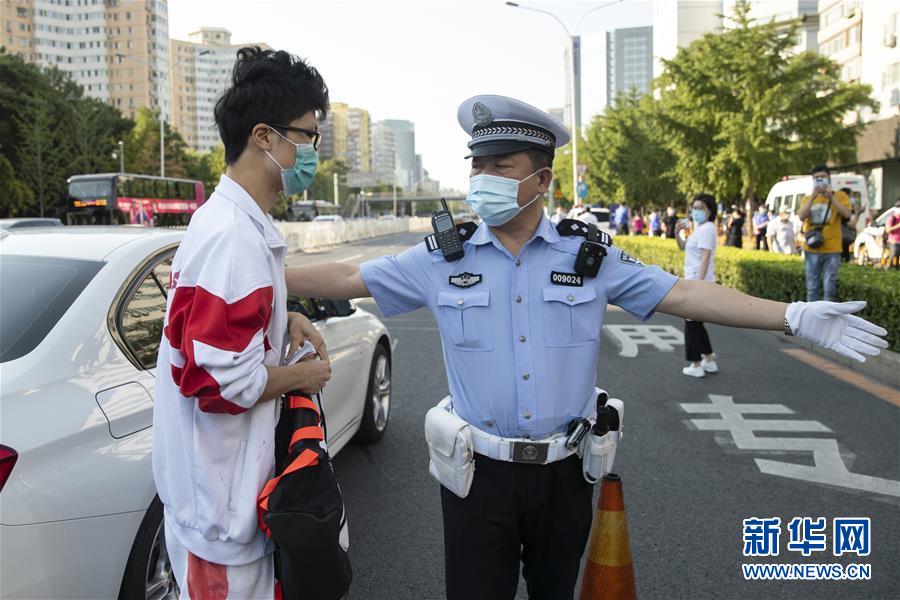 7月7日,在位于北京的中國人民大學(xué)附屬中學(xué)考點外,北京市公安局公安交通管理局海淀交通支隊中關(guān)村大隊交警付云輝在指揮車輛有序行駛。當(dāng)日,2020年高考拉開帷幕。新華社記者沈伯韓攝