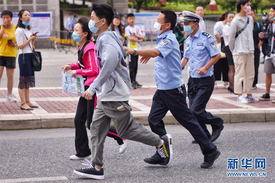 7月7日,在貴州省六盤水市第三中學(xué)考點外,兩名考生走錯考場,警察緊急安排車輛送他們前往正確的考場。當(dāng)日,2020年高考拉開帷幕。新華社記者劉續(xù)攝
