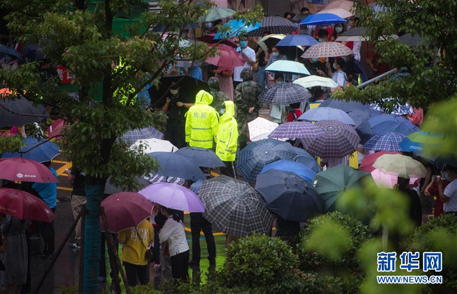 7月7日,在湖北省武漢市東湖中學(xué)考點(diǎn)外,民警在雨中執(zhí)勤。當(dāng)日,2020年高考拉開帷幕。新華社記者肖藝九攝
