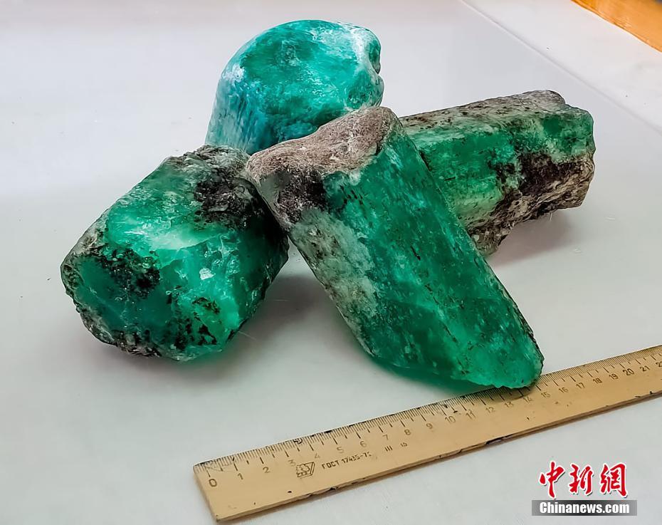當(dāng)?shù)貢r間7月7日,俄羅斯斯維爾德洛夫斯克州,俄羅斯國家技術(shù)集團在馬林斯克礦區(qū)內(nèi)發(fā)現(xiàn)總重量達4.8公斤的4塊綠寶石,是最近20年來發(fā)現(xiàn)的同類品質(zhì)中最大的寶石。圖片來源:視覺中國