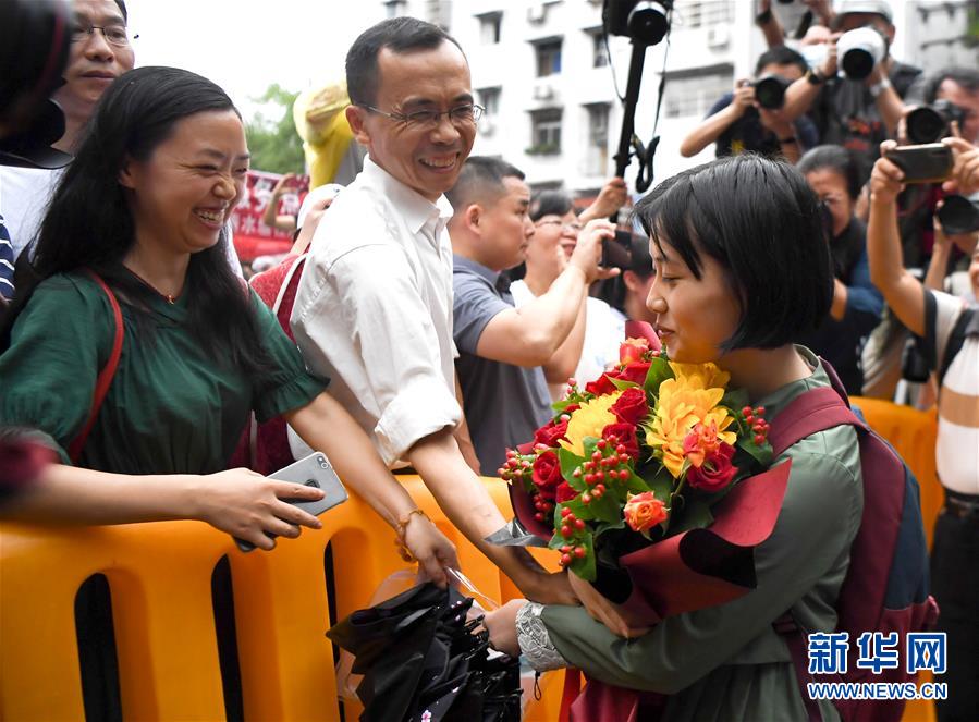 7月8日,一名考生(右)在湖南省長沙市一中考點外從家長手中接過鮮花。當日,全國部分地區(qū)2020年高考結(jié)束。新華社記者薛宇舸攝