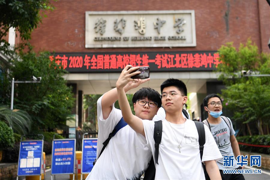 7月8日,在重慶市徐悲鴻中學(xué)考點,考生在考試結(jié)束后在校門口合影。當(dāng)日,全國部分地區(qū)2020年高考結(jié)束。新華社記者唐奕攝