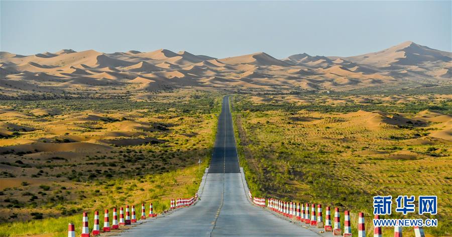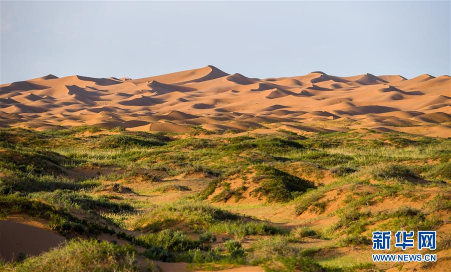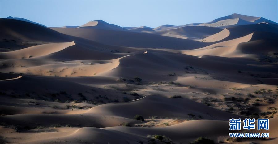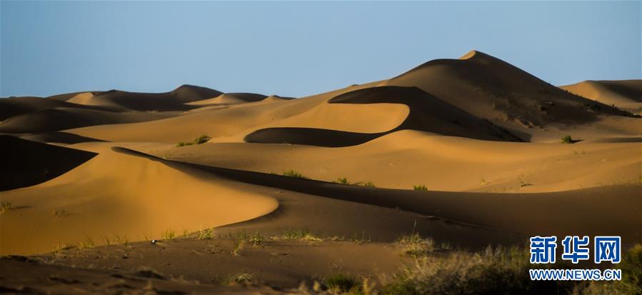 這是7月8日拍攝的騰格里沙漠風光。位于內(nèi)蒙古自治區(qū)阿拉善左旗西南部和甘肅省中部邊境的騰格里沙漠是我國第四大沙漠,總面積約為4.3萬平方公里。夏日傍晚,騰格里沙漠連綿的沙丘被日光勾勒出美麗的線條,美不勝收。新華社記者連振攝