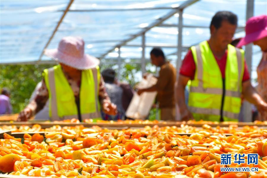 在新疆英吉沙縣一家合作社內,員工在晾曬杏子(7月2日攝)。新華社記者高晗攝