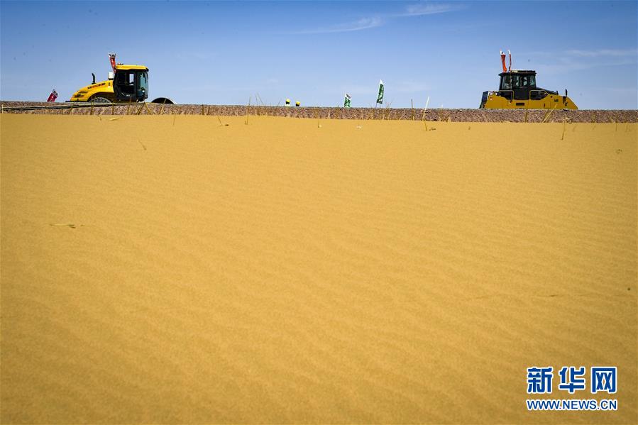7月10日,工人在位于寧夏境內(nèi)的烏瑪高速青銅峽至中衛(wèi)段A10標(biāo)段施工。盛夏時(shí)節(jié),位于寧夏境內(nèi)的烏瑪(內(nèi)蒙古烏海市至青海瑪沁縣)高速青銅峽至中衛(wèi)段正在抓緊施工建設(shè)。該路段主線全長(zhǎng)122.9公里,其中穿越騰格里沙漠腹地的18公里公路是寧夏建設(shè)的首條沙漠高速公路,預(yù)計(jì)2021年建成通車(chē)。新華社記者馮開(kāi)華攝。