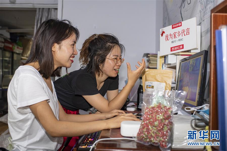 在位于新疆精河縣城的工作室內(nèi),朱虹美(右)和助手李紅英討論制作要發(fā)布的農(nóng)產(chǎn)品推廣視頻(7月11日攝)。新華社記者 胡虎虎 攝
