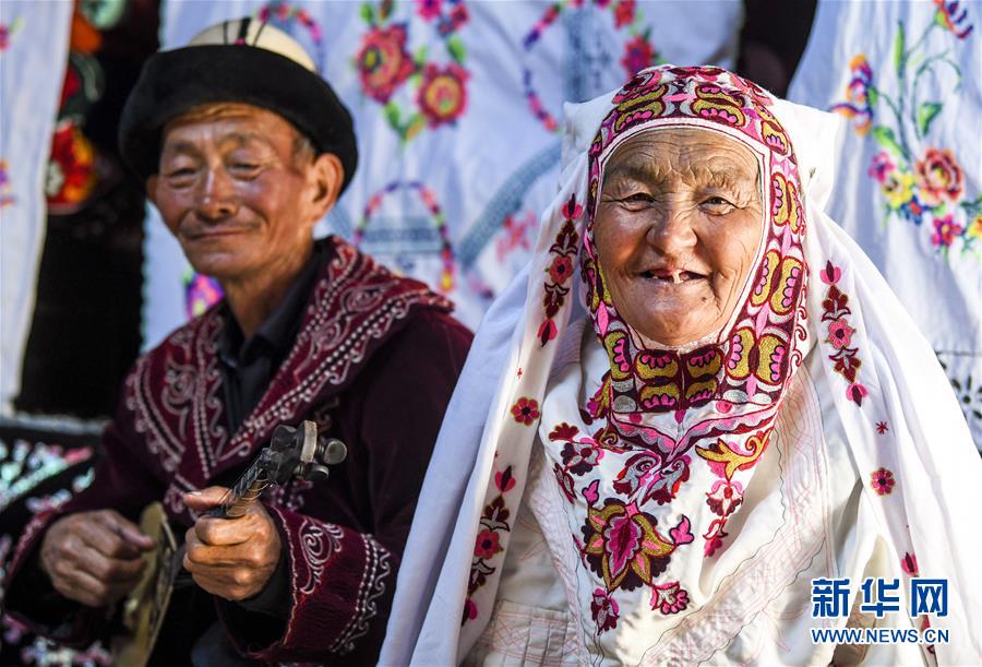 在新疆伊犁特克斯縣境內(nèi)的夏牧場里,兩位老人在氈房內(nèi)彈奏冬不拉唱歌(7月2日攝)。新華社記者 王菲 攝