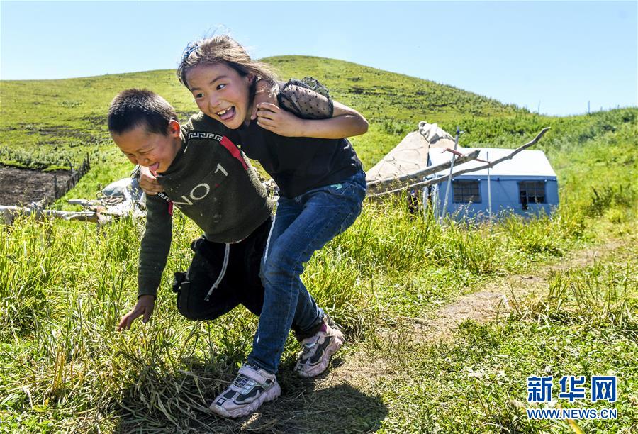 在新疆伊犁特克斯縣境內(nèi)的夏牧場(chǎng)里,兩名小朋友在玩耍(7月2日攝)。新華社記者 王菲 攝