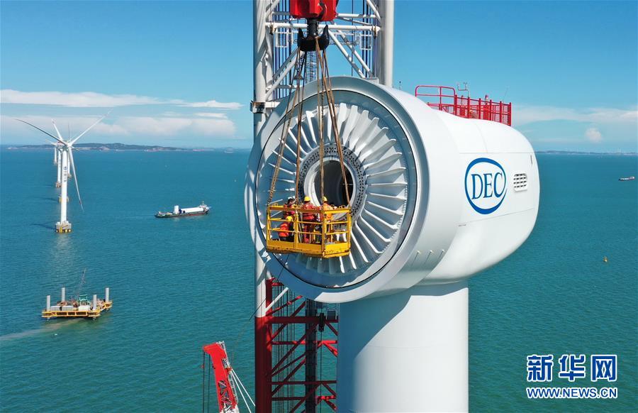 施工人員在福建福清興化灣二期海上風(fēng)電場10兆瓦海上風(fēng)電機(jī)組安裝現(xiàn)場忙碌(6月12日攝,無人機(jī)照片)。記者7月13日從三峽集團(tuán)了解到,國內(nèi)首臺10兆瓦海上風(fēng)電機(jī)組日前在三峽集團(tuán)福建福清興化灣二期海上風(fēng)電場成功并網(wǎng)發(fā)電,這是目前我國自主研發(fā)的單機(jī)容量亞太地區(qū)最大、全球第二大的海上風(fēng)電機(jī)組,刷新了我國海上風(fēng)電單機(jī)容量新紀(jì)錄。新華社記者 林善傳 攝