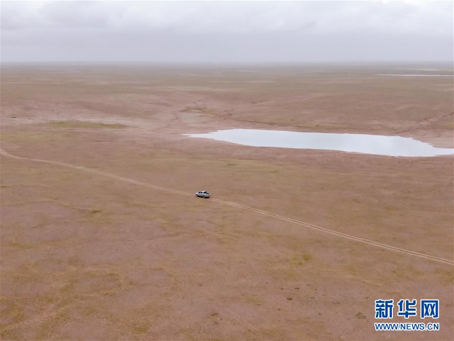 在可可西里索南達(dá)杰保護(hù)站管護(hù)區(qū)域,龍周才加與隊(duì)友們乘車巡視(6月30日攝,無(wú)人機(jī)照片)。新華社記者 張龍 攝