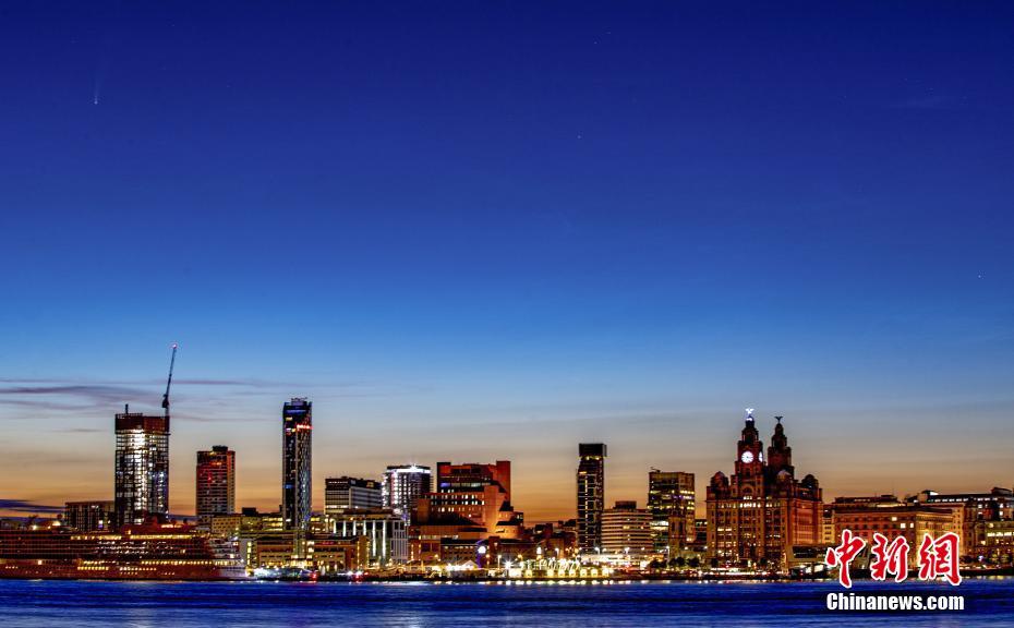 當(dāng)?shù)貢r間7月12日,英國利物浦,清晨時分,NEOWISE彗星出現(xiàn)在空中。圖片來源:視覺中國