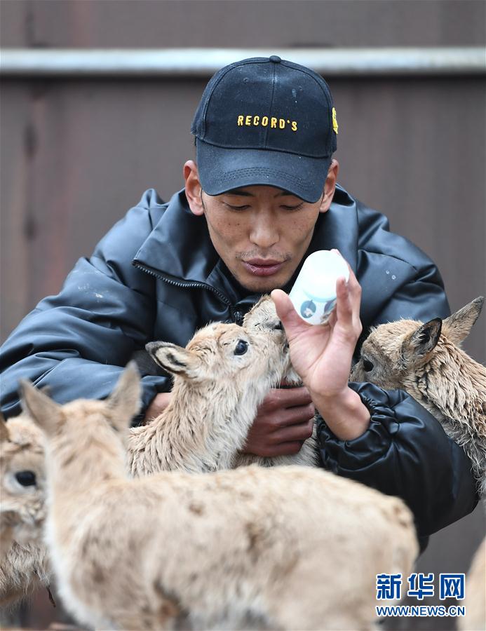 7月7日,三江源國(guó)家公園管理局長(zhǎng)江源園區(qū)可可西里管理處卓乃湖保護(hù)站的工作人員才文多杰在給藏羚羊幼仔喂奶。新華社記者 薛玉斌 攝