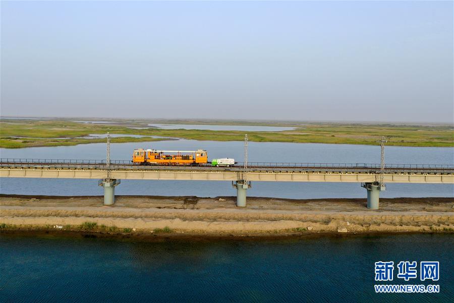 鋼軌打磨車在臺特瑪湖特大橋上作業(yè)(7月14日攝,無人機照片)。新華社記者 丁磊 攝
