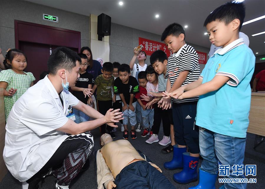7月16日,東林鎮(zhèn)衛(wèi)生院的醫(yī)護人員(左一)在給學(xué)生們示范和講解心肺復(fù)蘇的操作知識。當(dāng)日,浙江省湖州市吳興區(qū)東林鎮(zhèn)舉辦暑期“安全防護小超人”主題活動?;顒佑舍t(yī)護人員、消防隊員等為學(xué)生及家長講授日常安全避險及溺水急救知識,中小學(xué)們還在現(xiàn)場學(xué)習(xí)了簡易包扎、心肺復(fù)蘇的正確方式,并了解滅火器、滅火毯等消防器材的使用,為學(xué)生平安過暑期打好安全防護“預(yù)防針”。新華社記者 徐昱 攝