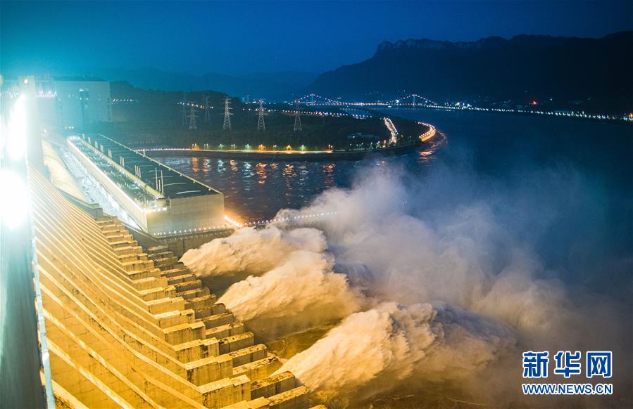 7月19日,三峽樞紐開啟泄洪深孔泄洪。19日20時(shí),三峽水庫入庫流量4.6萬立方米/秒,較本輪洪水的峰值6.1萬立方米/秒下降了1.5萬立方米/秒?!伴L(zhǎng)江2020年第2號(hào)洪水”平穩(wěn)通過三峽大壩。新華社記者肖藝九攝