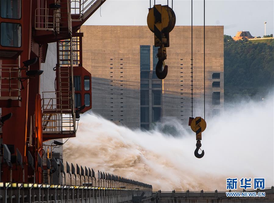 7月19日,三峽樞紐開啟泄洪深孔泄洪。19日20時(shí),三峽水庫入庫流量4.6萬立方米/秒,較本輪洪水的峰值6.1萬立方米/秒下降了1.5萬立方米/秒?!伴L江2020年第2號洪水”平穩(wěn)通過三峽大壩。新華社記者肖藝九攝