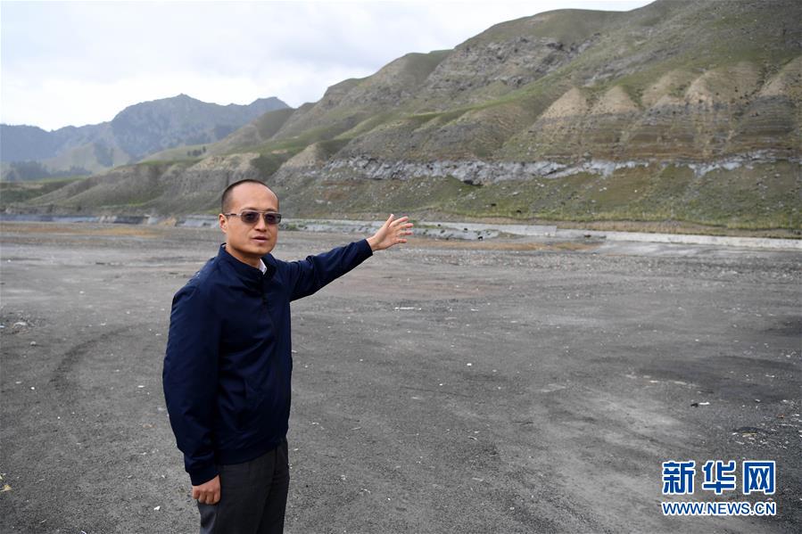 7月16日,烏魯木齊市生態(tài)環(huán)境局烏魯木齊縣分局局長(zhǎng)嚴(yán)偉濤介紹一家企業(yè)的礦坑被回填的情況。新華社記者沙達(dá)提攝