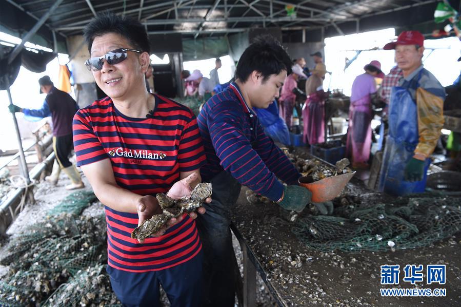 7月16日,福建省霞浦縣長(zhǎng)春鎮(zhèn)秋竹崗村養(yǎng)殖大戶俞開明(前左)在海上分揀平臺(tái)展示剛出水的三倍體生蠔。新華社記者姜克紅攝