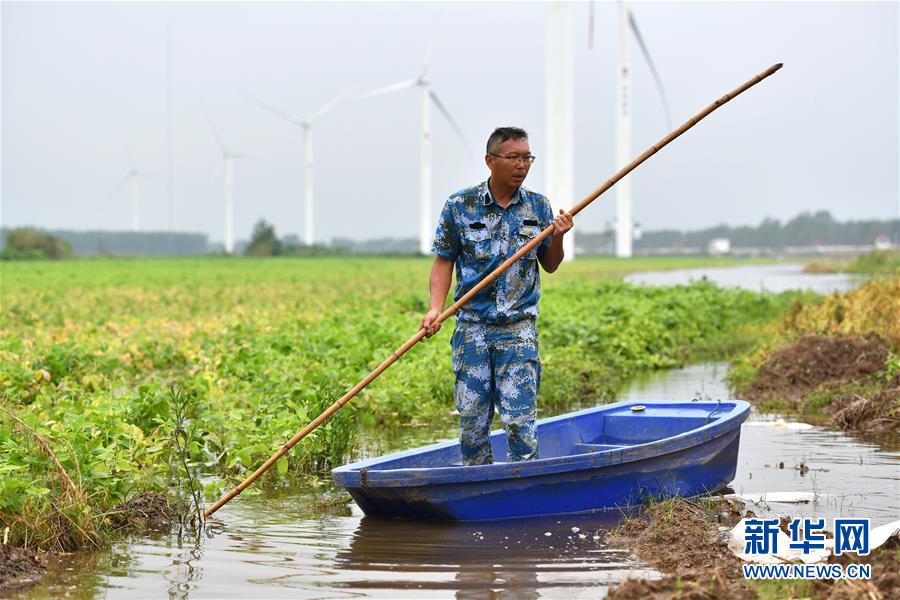 劉良武(右)與巡查人員在堤壩內(nèi)側(cè)處理一處泡泉(7月19日攝)。新華社記者張浩波攝