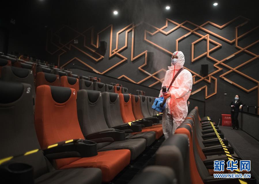 7月20日,武漢一家影院工作人員開展消殺作業(yè)。當日,在各項疫情防控措施有效落實到位的前提下,武漢市部分電影院恢復開放。新華社記者肖藝九攝