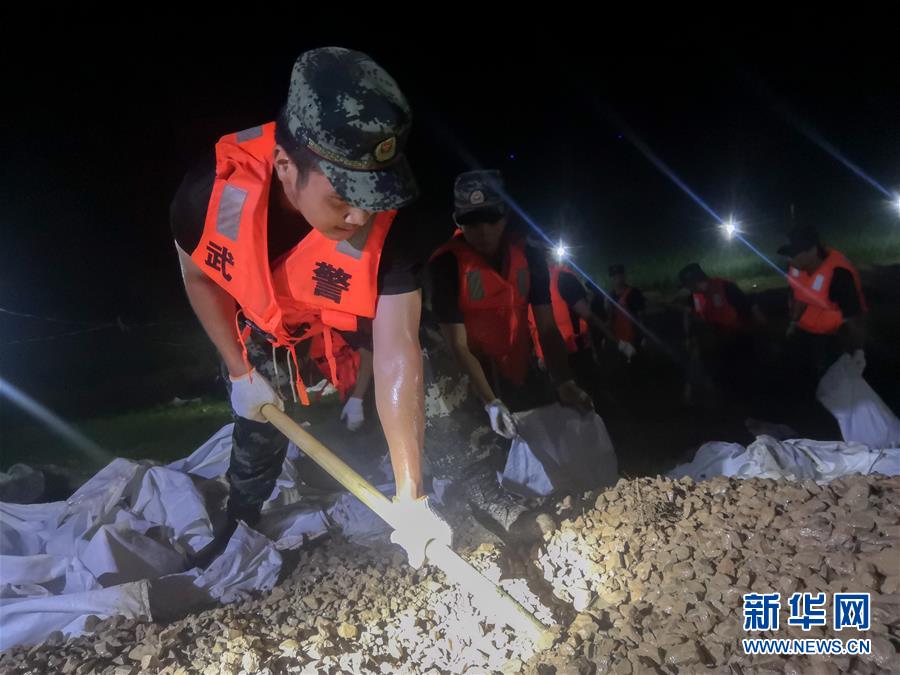 7月20日,在永固垸西線防洪大堤,武警湖南總隊(duì)岳陽(yáng)支隊(duì)官兵處置滲漏險(xiǎn)情。新華社發(fā)(尋樹(shù)文攝)