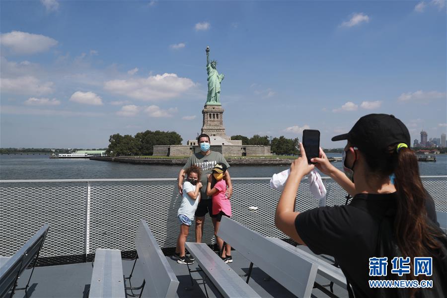 7月20日,參觀者在美國紐約前往自由島的游艇上拍照留念。美國紐約市20日繼續(xù)推進經(jīng)濟重啟計劃,宣布開始進入解封新階段,進一步允許部分低風險文娛活動重啟。自由女神像所在的自由島對公眾開放,但雕像內(nèi)部和博物館仍關閉。新華社記者王迎攝