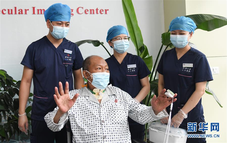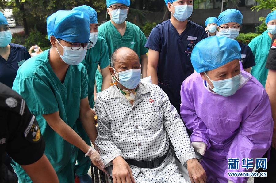 7月21日,武漢大學(xué)人民醫(yī)院醫(yī)護人員護送崔先生出院。新華社記者程敏攝