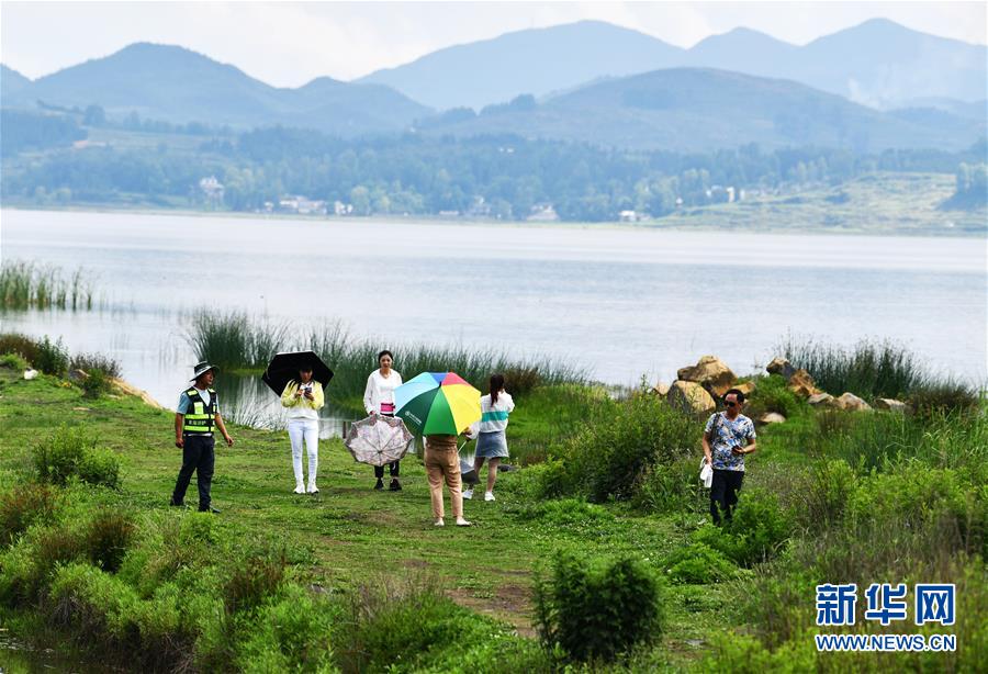 草海巡護(hù)員(左一)在勸導(dǎo)游客不要擅自進(jìn)入草海保護(hù)區(qū)內(nèi)游覽(6月10日攝)。新華社記者楊文斌攝
