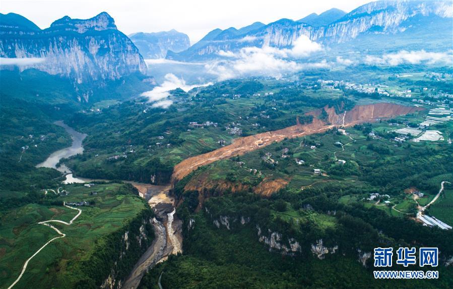 7月22日拍攝的因恩施州屯堡鄉(xiāng)馬者村山體滑坡形成的堰塞湖(無人機(jī)照片)。