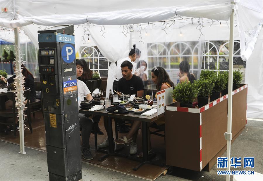 7月23日,在美國(guó)紐約,人們?cè)趹敉饩筒蛥^(qū)用餐。美國(guó)約翰斯·霍普金斯大學(xué)23日發(fā)布的新冠疫情最新統(tǒng)計(jì)數(shù)據(jù)顯示,美國(guó)累計(jì)確診病例超過400萬例。數(shù)據(jù)顯示,截至美國(guó)東部時(shí)間23日15時(shí)34分(北京時(shí)間24日3時(shí)34分),美國(guó)累計(jì)確診病例4007859例,累計(jì)死亡病例143846例。新華社記者王迎攝