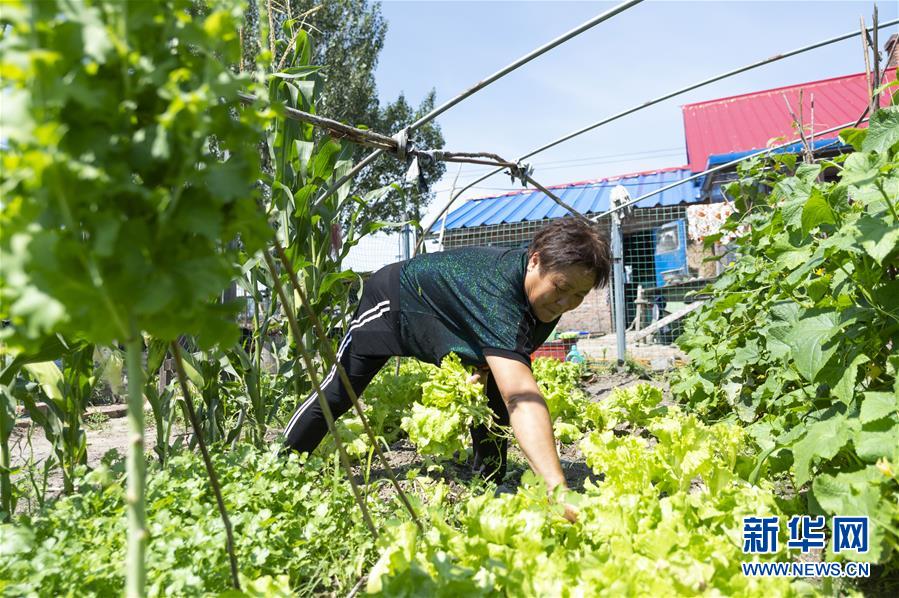 7月23日,在黑龍江省撫遠(yuǎn)市濃橋鎮(zhèn)東方紅村,康麗艷在自家庭院中摘菜。新華社記者 謝劍飛 攝