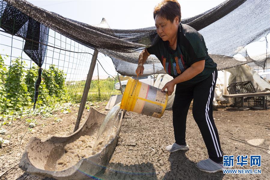 7月23日,在黑龍江省撫遠(yuǎn)市濃橋鎮(zhèn)東方紅村,康麗艷在給鴨和鵝準(zhǔn)備飲用水。新華社記者 謝劍飛 攝