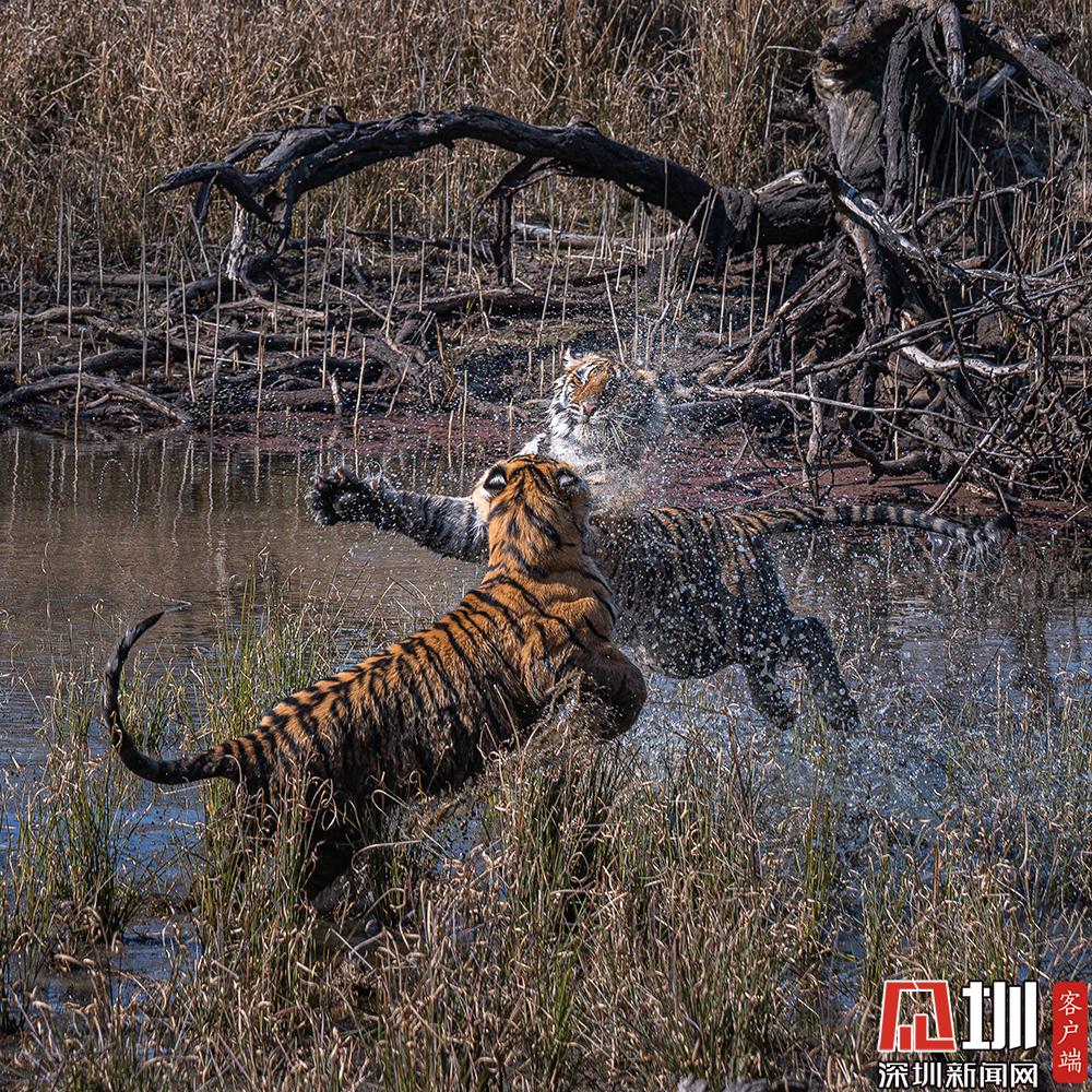 2020年7月27日,猛虎斗有多壯觀?來(lái)自印度德里的41歲職業(yè)業(yè)攝影師Nitish Madan,在在印度北部倫滕波爾國(guó)家公園游覽時(shí),見(jiàn)證了兩只老虎幼崽激烈的水上爭(zhēng)奪戰(zhàn)。從畫(huà)面中可以看到,兩只足足有200磅重的孟加拉虎,面對(duì)面互相咆哮,伸出虎爪兇猛至極,才15個(gè)月大就已經(jīng)有了王者風(fēng)范。