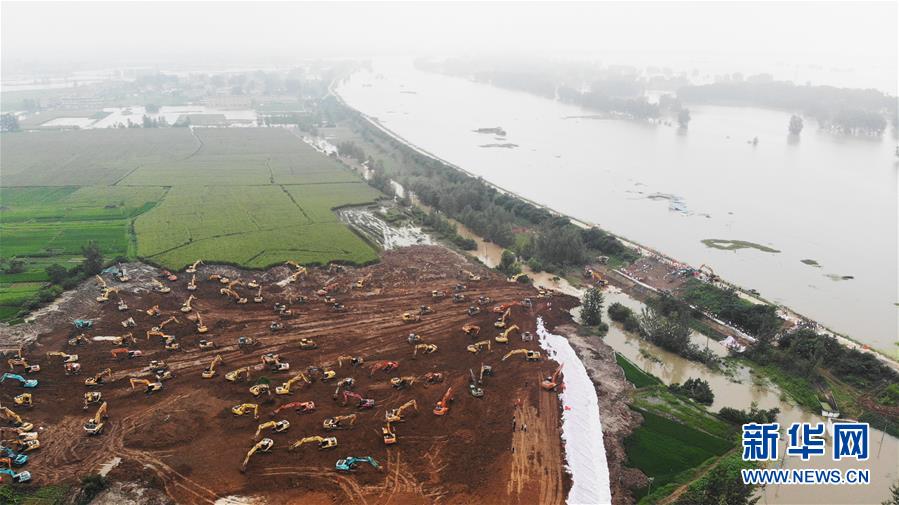 7月28日,在姜唐湖蓄洪區(qū)戴家湖一處涵閘險情處置現(xiàn)場,人們操作機(jī)械設(shè)備在搶筑臨時圩堤(無人機(jī)照片)。新華社記者黃博涵攝