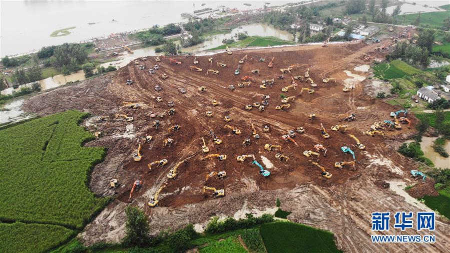 7月28日,在姜唐湖蓄洪區(qū)戴家湖一處涵閘險(xiǎn)情處置現(xiàn)場,人們操作機(jī)械設(shè)備在搶筑臨時(shí)圩堤(無人機(jī)照片)。新華社記者黃博涵攝
