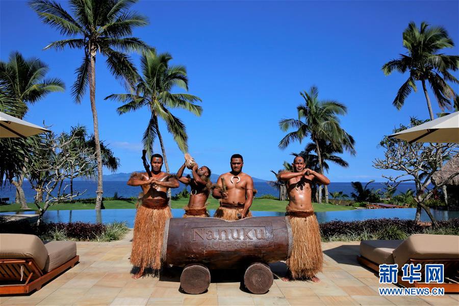 7月21日,在斐濟首都蘇瓦附近的納努庫奧博格海邊度假村,身穿草裙的斐濟“武士”為游客表演節(jié)目。新華社記者張永興攝