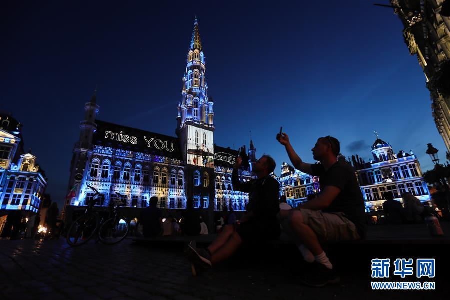 7月29日,比利時(shí)布魯塞爾大廣場的市政廳外墻上投射出“想念你,節(jié)日”的字樣。7月29日,比利時(shí)布魯塞爾大廣場舉行大型聲光秀。藝術(shù)家在市政廳等歷史建筑上投影文字和圖案,紀(jì)念這個(gè)夏天受新冠疫情影響而不能如期舉辦的文化活動(dòng)。新華社記者鄭煥松攝