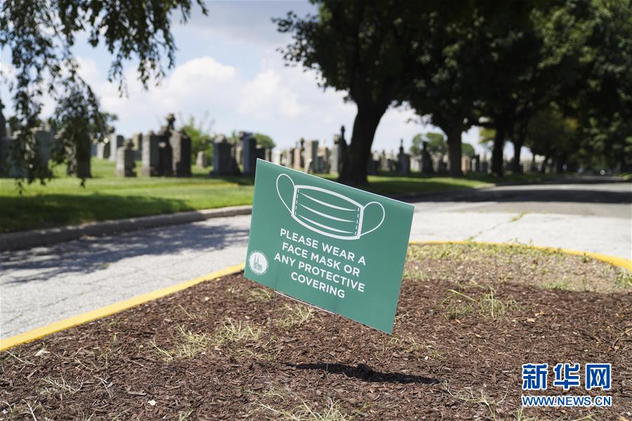 7月29日,在美國紐約一處墓地,提示牌提醒人們佩戴口罩。美國約翰斯·霍普金斯大學(xué)實時統(tǒng)計數(shù)據(jù)顯示,截至29日,美國累計新冠確診病例已超過440萬例,累計死亡病例超過15萬例。新華社記者王迎攝